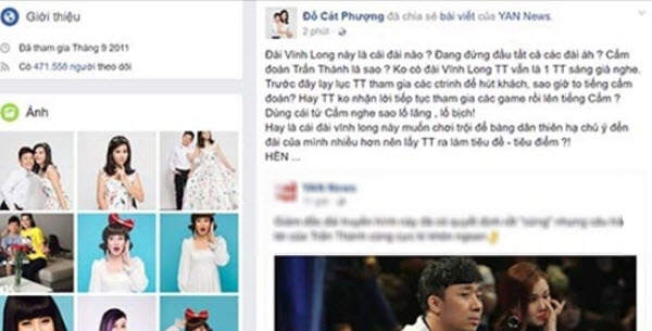 Nguyên văn status của Cát Phượng như sau: “Đài Vĩnh Long này là cái đài nào? Đang đứng đầu tất cả các đài à? Cấm đoán Trấn Thành là sao? Không có đài Vĩnh Long Trấn Thành vẫn là 1 Trấn Thành sáng giá nghe. Trước đây lạy lục Trấn Thành tham gia các chương tŕnh để hút khách, sao giờ to tiếng cấm đoán? Hay Trấn Thành không nhận lời tiếp tục tham gia các game rồi lên tiếng cấm? Dùng cái từ cấm nghe sao lố lăng, lố bịch! Hay là cái đài Vĩnh Long này muốn chơi trội để bàn dân thiên hạ chú ư đến đài của ḿnh nhiều hơn nên lấy Trấn Thành ra làm tiêu đề – tiêu điểm ?!