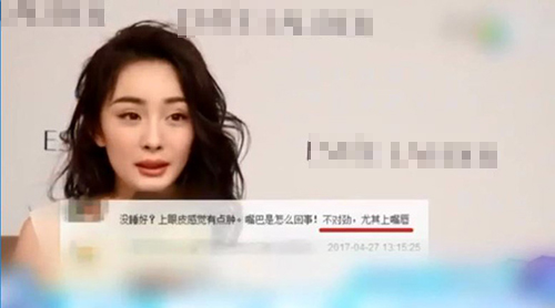 Dương Mịch có đôi mắt húp và đôi môi sưng vù khác hẳn với trước kia. Nhiều người cho rằng gương mặt của bà xã Lưu Khải Uy thiếu tự nhiên và thô cứng đến mức vô cảm đặc biệt là mỗi khi cười.