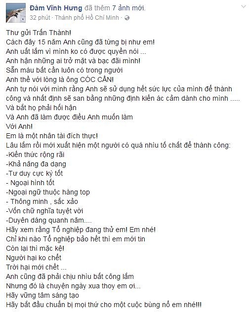 Mới đây, ca sĩ Đàm Vĩnh Hưng cũng vừa viết một bức tâm thư gửi tới nam danh hài. Theo đó, giọng ca Giã từ nhắc lại sự việc cách đây 15 năm, anh cũng rơi vào trường hợp tương tự ông xã Hari Won. Sau tất cả, Mr. Đàm đã tự nhủ với lòng phải cố gắng thành công, san bằng những định kiến ác cảm về mình và bắt mọi người phải hối hận với những điều đã làm.