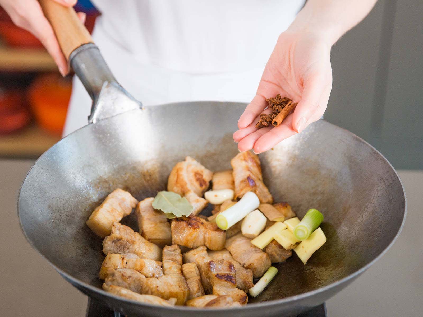 - Thêm hành, gừng, ớt, quế, lá nguyệt quế vào chảo, đổ hỗn hợp đường vào đảo đều và đun vài phút tới khi đường bám đều quanh thịt.
