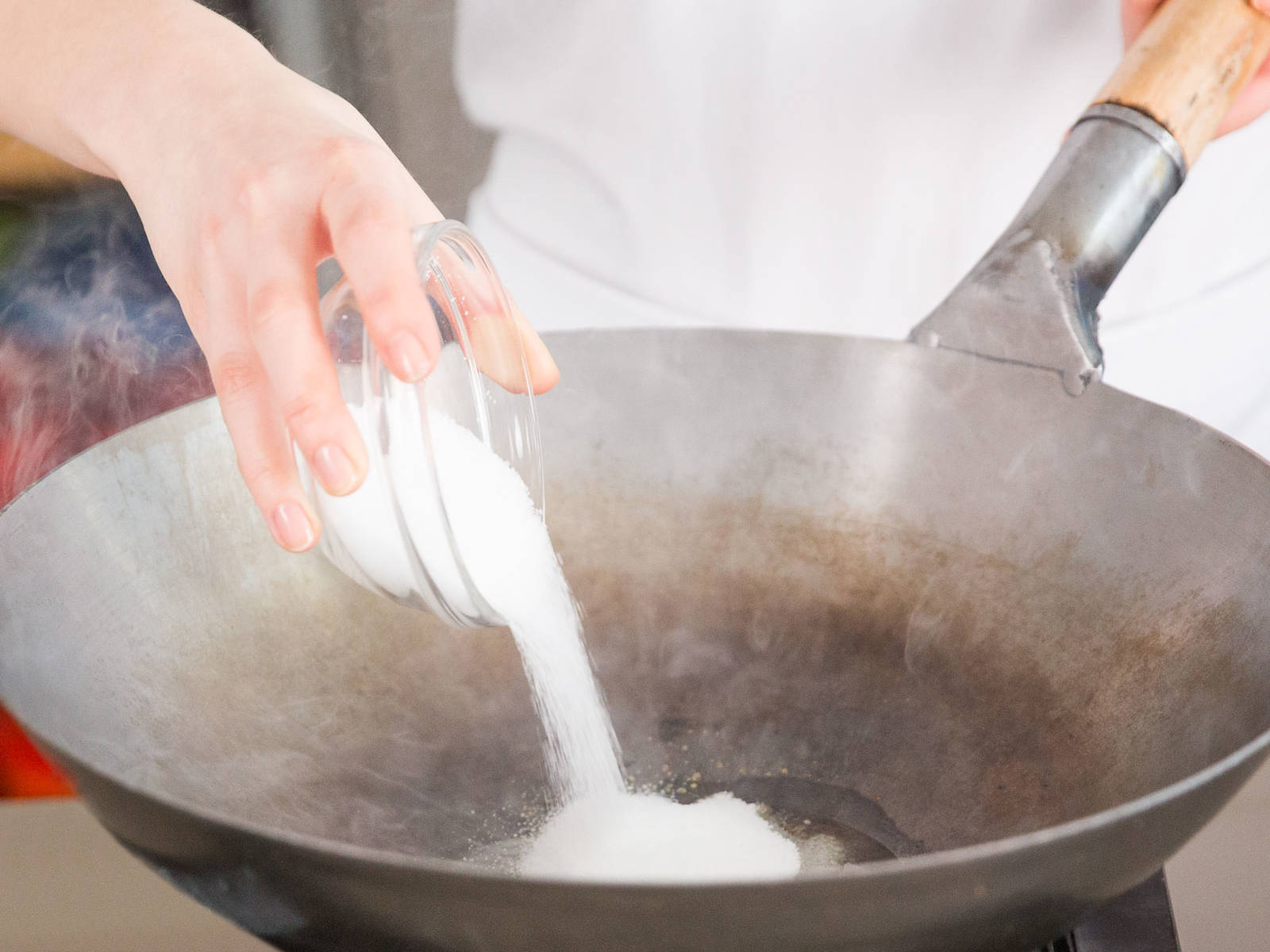 - Cho đường và 35ml dầu vào chảo, đun nhỏ lửa 3-5 phút tới khi đường tan hết tạo thành màu nâu vàng đẹp mắt. Thêm 1 chút nước để hỗn hợp đường không bị đặc quá. Trút ra bát.