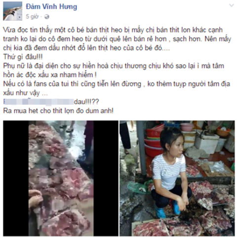 Theo trên trang Facebook cá nhân, ca sĩ Đàm Vĩnh Hưng chia sẻ: “Vừa đọc tin thấy một cô bé bán thịt heo bị mấy chị bán thịt lợn khác cạnh tranh không lại do cô đem bán heo từ dưới quê lên bán rẻ hơn, sạch hơn. Nên mấy chị kia đã đem dầu nhớt đổ lên thịt heo của cô bé đó. Thứ gì đâu! Phụ nữ là đại diện cho sự hiền hòa, chịu thương chịu khó, sao lại ì mà tâm hồn ác độc xấu xa, nham hiểm..."