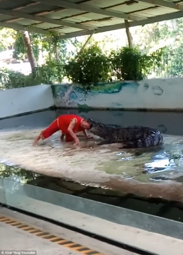 Vietbf.com - Nhiều người bàng hoàng nhìn thấy cảnh nghệ sĩ xiếc Thái Lan đang biểu diễn thì bất ngờ bị cá sấu ngoạm vào đầu, khiến nghệ sĩ này la hét thất thanh sau đó đã hôn mê, vì vùng hai bên thái dương có vết cắn rất sâu.