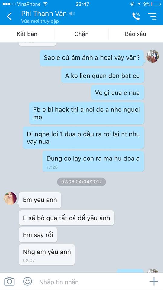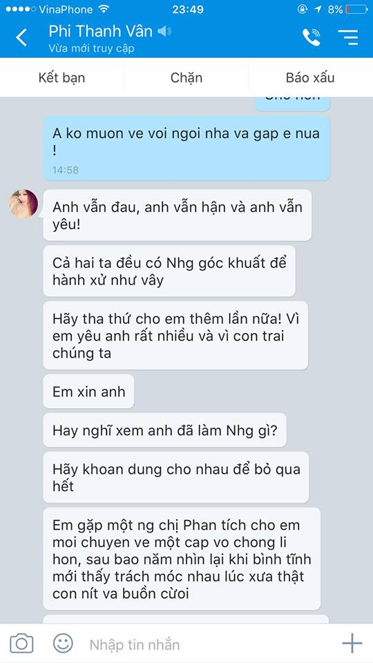 Sau đó Bảo Duy cho biết thêm: Vốn cả hai đã hoàn thành thủ tục ly hôn từ tháng 1, nhưng đến tháng 4 vừa qua Phi Thanh Vân vẫn nhắn tin thổ lộ cô yêu anh, mong anh quay về. Trong các đoạn tin nhắn, Phi Thanh Vân thể hiện mình nhớ chồng không ngủ được, phải đi nhậu để quên đời, thậm chí còn gửi các bài tư vấn tình yêu hôn nhân để chồng cũ đọc.
