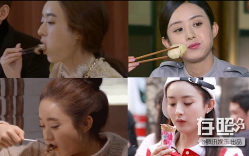 Triệu Lệ Dĩnh từng tiết lộ, niềm đam mê của cô là ăn uống. Chính vì thế, khi đảm nhận vai diễn Sam Sam trong phim Sam Sam đến rồi có nhiều cảnh quay ăn uống, người đẹp sinh năm 1987 không ngại ngần “ăn thả phanh”. Sau khi phim đóng máy, Lệ Dĩnh tăng lên gần 4kg (ảnh trái trên và dưới). Khi đóng Yên chi, cô nàng Hoa Thiên Cốt rất hào hứng khi quay cảnh ăn (ảnh trên bên phải). Ngay cả tham gia show Thần tượng đến rồi mùa 1, nữ diễn viên Sở Kiều truyện cũng ăn uống rất ngon lành bất chấp lúc ghi hình hay nghỉ ngơi.