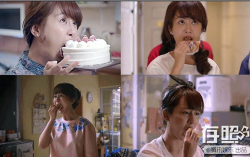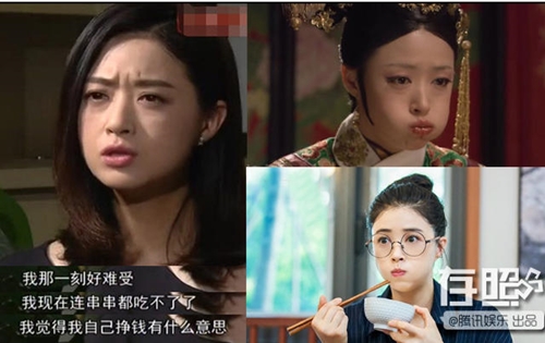 Tưởng Hân cũng là một trong những người đẹp có niềm đam mê ăn uống. Diễn viên Thiên long bát bộ từng chia sẻ, nếu không ăn, cô chẳng có động lực để làm việc và kiếm tiền. Tưởng Hương ăn "phồng miệng" trong Hậu cung Chân Hoàn truyện (ảnh trên bên phải) và Manh ước (ảnh dưới bên trái).
