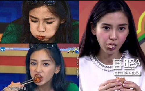 Người mẫu Hoàng Thùy từng trở thành đề tài chế ảnh của cư dân mạng khi ăn chè... quên xỉa răng trong tập 2 The Face 2017. Vì lịch quay gấp gáp khiến Quán quân Vietnam’s next top model quên mất việc xỉa răng khiến cô rơi vào trường hợp dở khóc dở cười. Ngoài Hoàng Thùy, các diễn viên hàng đầu Cbiz lại rất thoải mái về việc ăn uống khi đóng phim, quay truyền hình thực tế. Thậm chí, nhiều ngôi sao còn ăn uống “bạt mạng” bất chấp cả hình tượng.