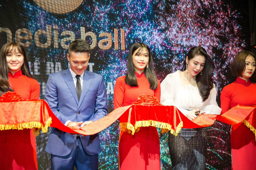Ca sỹ Thủy Tiên cùng chồng cắt băng thành lập công ty của mình gần đây.