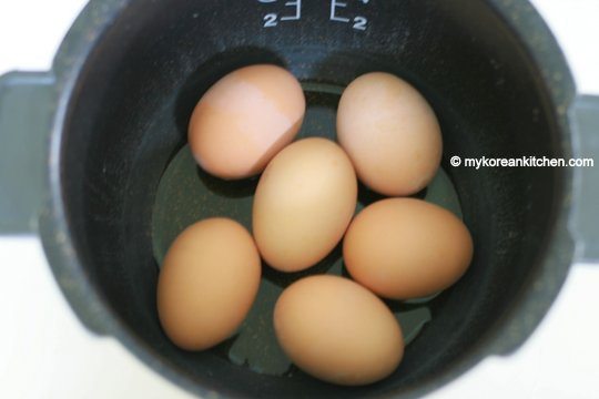 - Vớt trứng ra cho vào nồi cơm điện, hòa muối với nước ấm và đổ vào nồi. Cắm điện và luộc trong 50 phút.