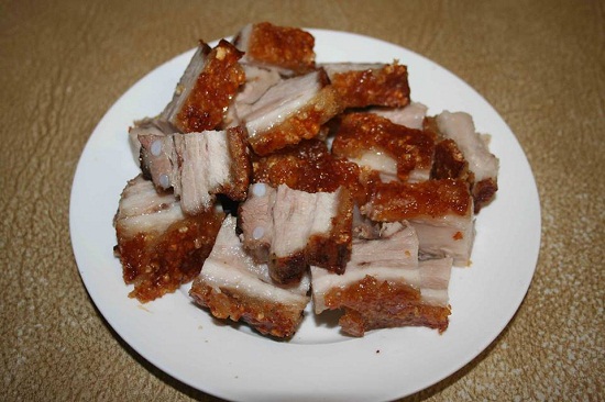 – Phần thịt đem ướp với ngũ vị hương, đường, tiêu, bột hành, bột tỏi, bột gừng, chút muối. Còn phần da chỉ việc dùng đầu dao nhọn hoặc que chích mụn đâm lỗ lỗ rồi quết hỗn hợp dấm và muối thôi.