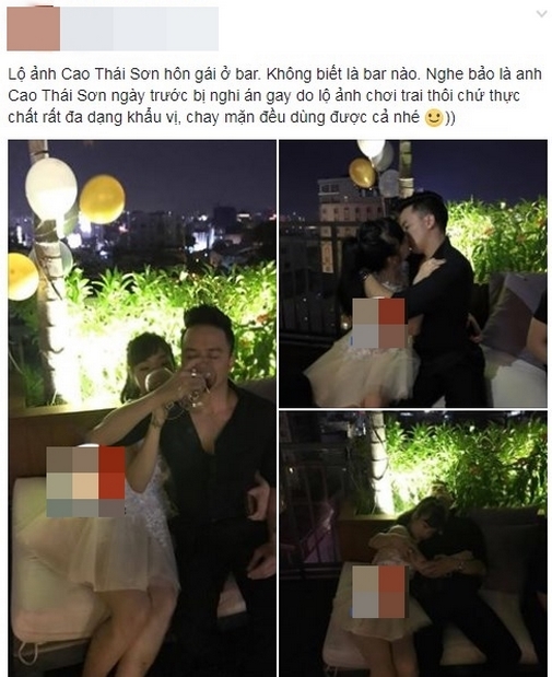 Cách đây ít giờ, trên một Fanpage đã đăng tải những hình ảnh tình tứ cửa một cặp trai gái ở trong quán bar, page này ghi rõ đó là hình ảnh của nam ca sĩ Cao Thái Sơn. Nhìn những hình ảnh được cho là của Cao Thái Sơn khá choáng, anh uống rượu say bí tỉ, còn ôm hôn cô gái lạ mặt đó, một lúc sau lại nằm ngả ngớn ra ghế sofa rất mất hình tượng.