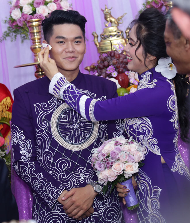 Lê Phương ân cần chăm sóc chồng trẻ khi thấy anh hồi hộp trong lúc làm lễ xin dâu.