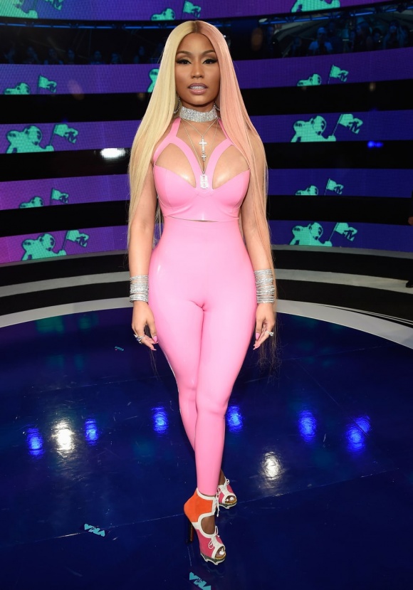 Nicki Minaj mặc đồ jumsuit màu hồng ôm sát cơ thể