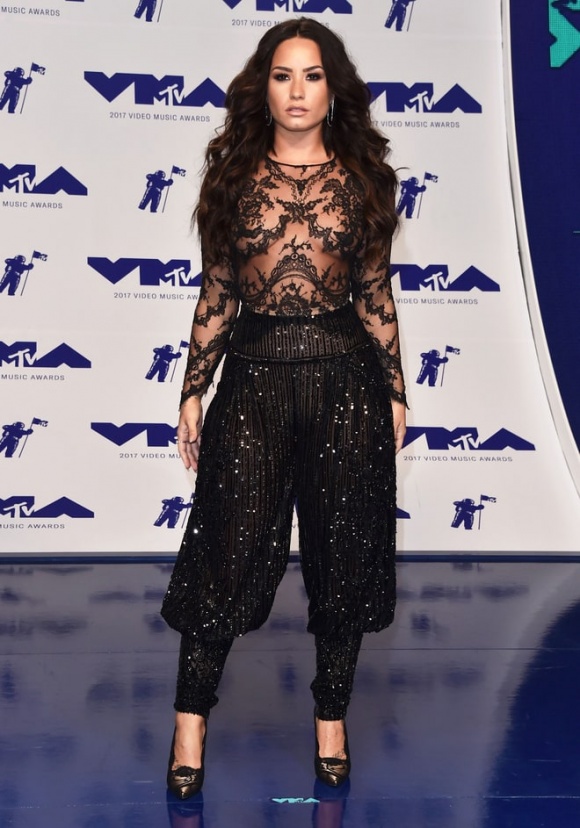 Nữ ca sĩ Demi Lovato cá tính, nổi bật với trang phục áo ren kết hợp quần sequin lấp lánh