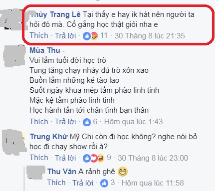 Ồn ào chuyện cô ruột Phương Quế Như "tố" vô ơn, gặp mặt không chào vừa tạm lắng xuống, Phương Mỹ Chi lại tiếp tục trở thành tâm điểm chú ý của cộng đồng mạng liên quan đến vấn đề học tập. Bởi, không ít người hâm mộ thắc mắc chuyện học hành của cô bé dân ca tại trường. Thậm chí, nhiều người lo lắng thay cho Phương Mỹ Chi khi em liên tục chạy show, góp mặt trong nhiều chương trình giải trí thì thời gian đâu dành cho việc học.