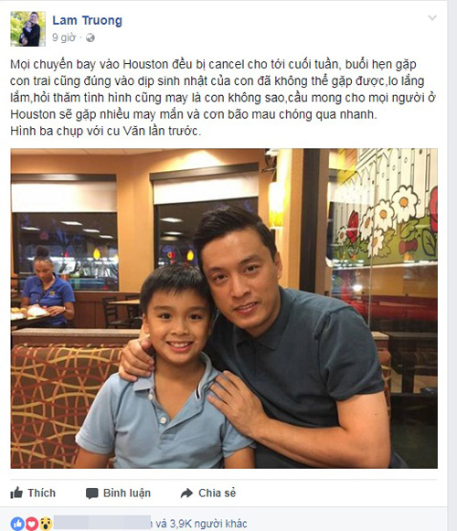 Cơn bão Harvey đang gây ra lũ lụt nặng nề khiến thành phố Houston, bang Texas của Mỹ bị cô lập. Vì con trai Kiến Văn đang sinh sống ở Houston nên Lam Trường tỏ ra lo lắng cho tình hình của cậu bé. Trên trang cá nhân, giọng ca Tình thôi xót xa viết: "Mọi chuyến bay vào Houston đều bị cancel cho tới cuối tuần, buổi hẹn gặp con trai cũng đúng vào dịp sinh nhật của con đã không thể gặp được, lo lắng lắm, hỏi thăm tình hình cũng may là con không sao. Cầu mong cho mọi người ở Houston sẽ gặp nhiều may mắn và cơn bão mau chóng qua nhanh", kèm theo đó là ảnh chụp anh và cậu quý tử 10 tuổi.