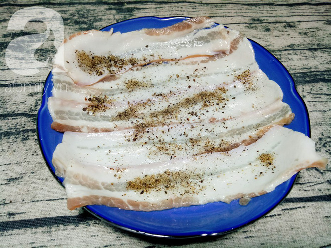 Thịt thăn rửa sạch, để ráo, cắt thành miếng bản lớn (bạn có thể mua loại thịt ba chỉ thái lát sẵn đóng khay có bán sẵn tại các siêu thị). Trải từng miếng thịt ra rồi rắc muối và tiêu lên trên mặt thịt.