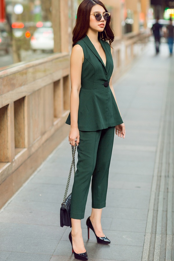 Sắc xanh lá thẫm tạo nên vẻ ngoài thanh lịch cho người đẹp 9X với dáng vest cách điệu, không tay kết hợp cùng quần âu ống ôm khoe chân thon, dài.