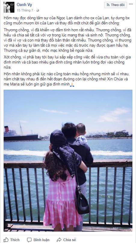 Vy Oanh từng chia sẻ: "Thương chồng, vì đã khiến vợ đằm tính hơn rất nhiều. Thương chồng, vì đã hiểu và chia sẻ tất cả với vợ trong lúc mang thai và sinh nở. Thương chồng, vì đã vì vợ và con mà thay đổi bản thân rất nhiều. Thương chồng, vì thương vợ mà xắn tay tự làm tất cả mọi việc mặc dù trước nay được quen hầu hạ. Thương cả sự giản dị, mộc mạc không bề ngoài nữa.