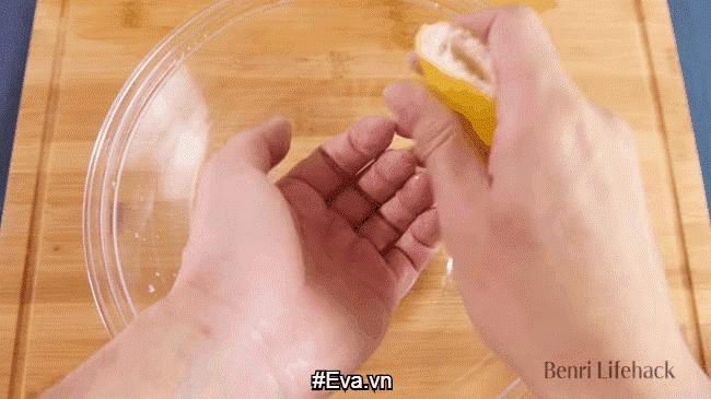 Sau đó, bạn bóp vỏ để tinh dầu bắn ra tay đồng thời xoa vỏ lên tay, các kẽ và móng tay. Mùi thơm từ tinh dầu của vỏ các loại quả này sẽ giúp tay bạn hết mùi tanh hoàn toàn.