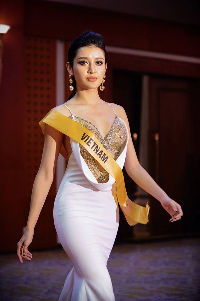 Bởi, thiết kế của bộ váy ôm sát đường cong cơ thể và xuyên thấu trước ngực giúp Huyền My tự tin khoe vòng eo 59cm đọ sắc với dàn thí sinh quốc tế.