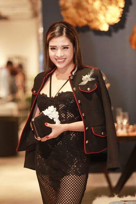Cũng không kém cạnh với cách chọn váy để khoe được những ưu điểm và che đi những nhược điểm. người đẹp chân dài Phan Hoàng Thu, diện tất lưới cùng váy ren và ngoài áo khoác ngoài. Tuy nhiên chiếc váy ren của cô quá ngắn khiến cô lộ đôi chân hơi "khủng" khi đứng cạnh doanh nhân Dương Quốc Nam.