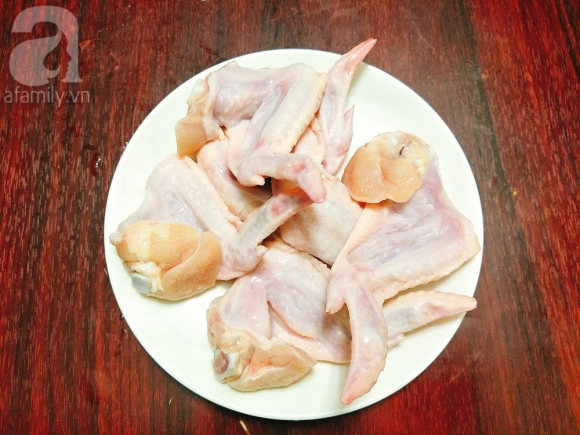 Cánh gà đem rửa sơ qua sau đó cho 1 chút giấm, muối và bóp kỹ rồi rửa lại vài lần cho thật sạch, thấm cho khô hết nước.