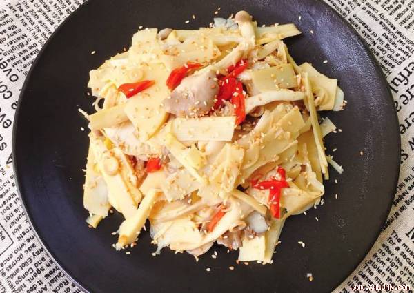 Bước 6: Cho măng và nấm ra đĩa, rắc vừng rang lên trên rồi thưởng thức nóng!