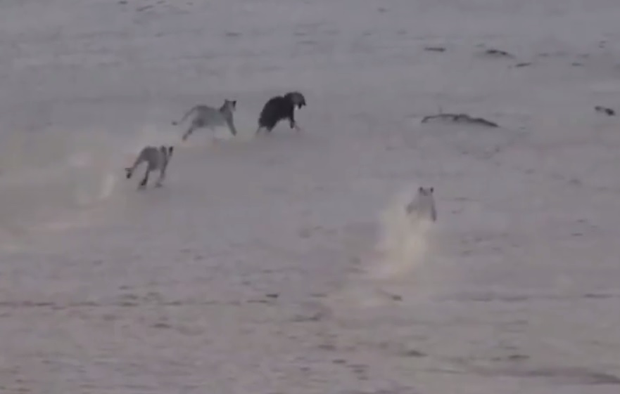 Linh cẩu thấy 4 con sư tử xuất hiện cùng lúc thì ngay lập tức quay đầu bỏ chạy. May mắn là linh cẩu đã chạy thoát nanh vuốt của 4 chúa tể sa mạc dù bị đuổi theo sát nút.