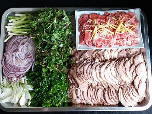 - Thịt bò (phần làm bò tái) thái mỏng ướp cùng chút gừng thái chỉ.