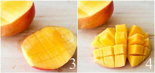 Cách làm: Cắt một mặt phẳng ở phần cuống quả xoài. Cắt phần thịt xoài hai bên má quả xoài theo hướng từ trên xuống.