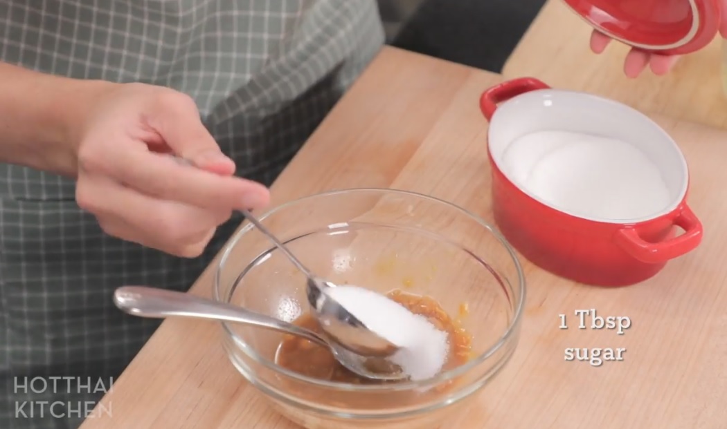 Làm nước sốt: Lấy một chén nhỏ, bỏ vào đậu tương Thái Lan ( tao jiew), đường, nước, và khuấy để đường hòa tan.