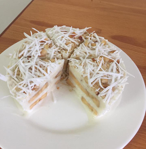 - Múc một ít hỗn hợp sữa cho vào hộp, dàn đều trong đáy hộp. Sau đó xếp lên trên một lớp chuối, tiếp đến là một lớp đậu phộng đã giã nhỏ rồi đến một lớp dừa nạo, lặp lại như vậy cho đến khi hết nguyên liệu. Lớp trên cùng rắc thêm một lớp đậu phộng giã nhỏ và dừa nạo cho đẹp.