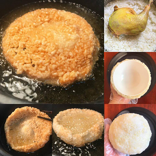 - Cho xôi ra ngoài để nguội hẳn thì thả vào nồi dầu đang sôi già và giữ nguyên cho xôi định hình trong 30-45 giây thì lật. Chiên vàng giòn, hạt xôi nở đều như miếng cơm cháy có hình chiếc bát nhỏ là ta được đế giòn của món xôi lạ này.