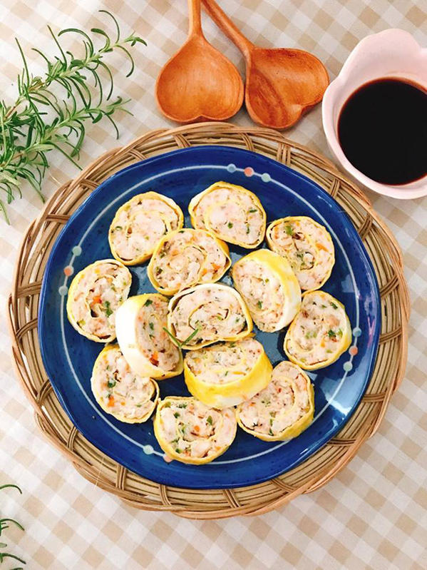 - Trứng cho vào bát với ít muối đánh tan. Làm nóng chảo cho ít dầu vào, cho trứng vào chiên mỏng, trứng chín lấy ra đĩa, cho tôm vào quét đều lên trứng. Sau đó cuộn tròn lại hấp 20-30 phút cho tôm chín.