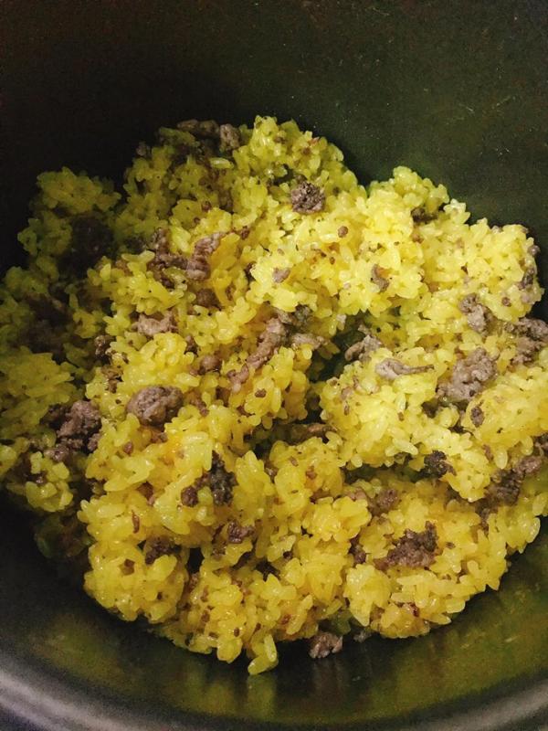 - Khi nồi đã bật về nút warm lần 2, mở nồi, cho thịt chim đã xào chín vào, trộn đều. Bật nút cook lần nữa. Lúc này sẽ rất nhanh thôi, nút warm sẽ nhảy lại, cứ để như thế cho tới khi ăn xôi vẫn còn nóng hổi.