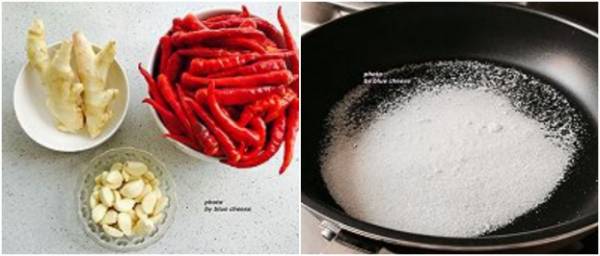 Phần gừng cạo cạch vỏ, ớt khô bóc vỏ rồi để riêng.