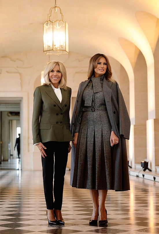 Bà Melania mặc một chiếc váy dài màu xám, xếp ly phần chân váy và cách điệu ở cổ áo. Không thua kém phu nhân tổng thống Mỹ, phu nhân tổng thống Pháp, bà Brigitte Macron, cũng gây ấn tượng bằng cách thay ba bộ trang phục trong ngày hôm qua.