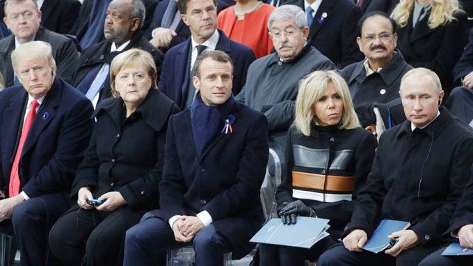 Bà Brigitte ngồi cùng hàng ghế với chồng và Tổng thống Nga Putin, Tổng thống Mỹ Trump và Thủ tướng Đức Merkel trong lễ tưởng niệm 100 năm kết thúc Chiến tranh thế giới thứ nhất ở Khải Hoàn Môn, Paris, sáng 11/11. Ảnh: Reuters.
