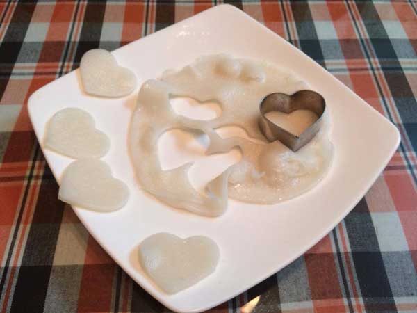 - Úp bánh ra thớt, 2 bánh phở chồng lên nhau để nguội, cuộn lại rồi cắt hình tùy thích.