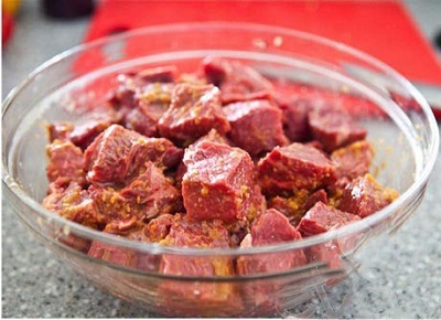 Thịt bò rửa sạch, thái miếng vuông vừa ăn. Đun lấy một nồi nước sôi, thả miếng gừng vào, sau đó trần qua thịt bò trong vòng 2 phút để loại bỏ hết phần tạp chất ở thịt bò.
