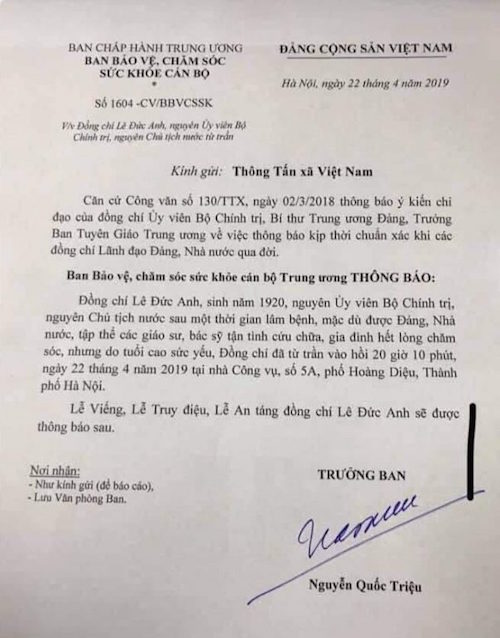 Nguồn tin từ cán bộ một cơ quan của Đảng cho biết thêm: “Có khả năng nguyên Chủ tịch nước Lê Đức Anh sẽ được đưa về an táng tại miền Nam“.