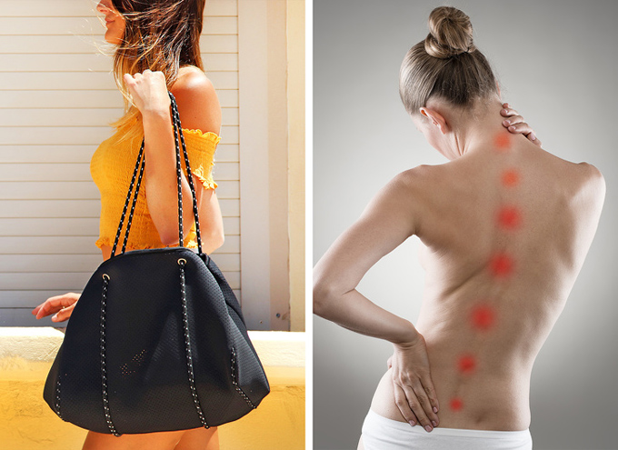 Nhiều chị em có thói quen dùng túi "khổng lồ" như một kho chứa đồ, thoải mái đựng trong đó từ mỹ phẩm đến laptop. Điều này tiện lợi nhưng lại không an toàn cho sức khỏe. Thường xuyên đeo túi nặng trên một vai dễ dẫn đến vẹo cột sống và thoái hóa xương khớp. Do mất cân bằng, bạn có thể bị co thắt cơ, tắc mạch máu và chèn ép dây thần kinh.