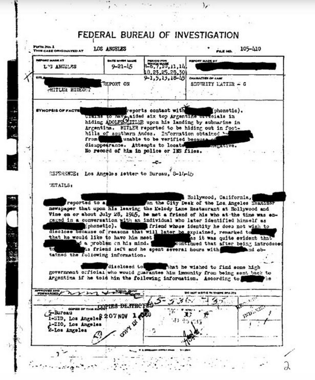 Một trong những thông tin FBi thu thập được là khả năng Hitler đến Argentina khoảng 2-3 tuần sau khi Berlin thất thủ.