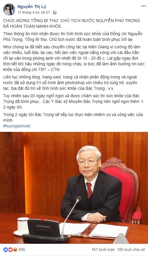 Ngày 17/4/2019 CSVN đăng tin Nguyễn Phú Trọng sẽ khỏe lại và ngày 19-20 sẽ đi làm việc, tuy nhiên giờ chẳng thấy ông Trọng đâu.