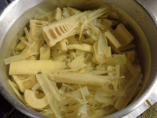 - Đun sôi một nồi nước, luộc măng khoảng 5 phút, vớt bỏ vào nước lạnh, rửa sạch và để ráo.