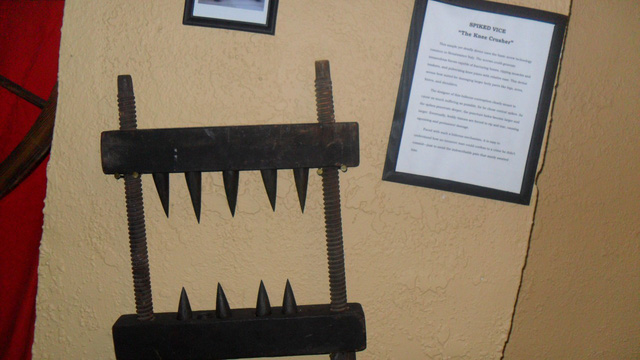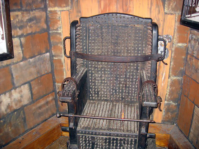 Có những chiếc ghế còn có cả chông nhọn bằng kim loại khắp ghế. Sau này trong nhà tù, chiếc ghế này trở thành ghế điện để hành quyết tội phạm.