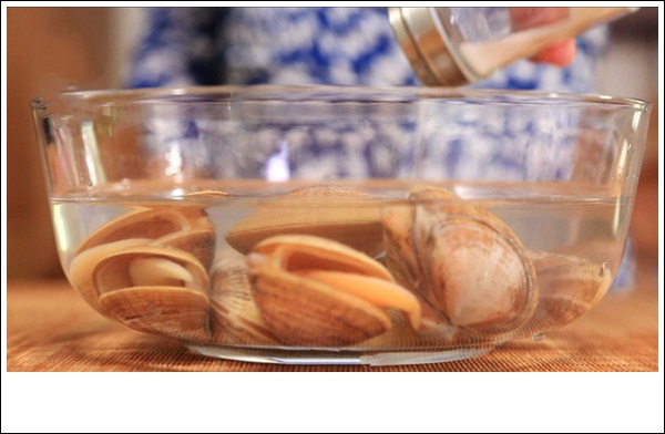Ngao rửa sạch, ngâm với nước muối pha loãng khoảng 4 giờ cho ngao nhả sạch bùn cát.