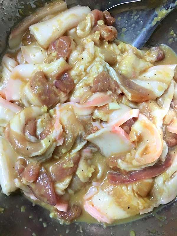 Cách ướp như sau, phần gia vị chia đều để ướp đủ phần chả và phần thịt: 2 thìa sữa ông thọ, 1 thìa hạt tiêu, nước cốt sả, 2 thìa cà phê đường, 1 thìa canh dầu hào (thìa ăn phở), 1 thìa canh nước mắm, 1 thìa cà phê mật ong.