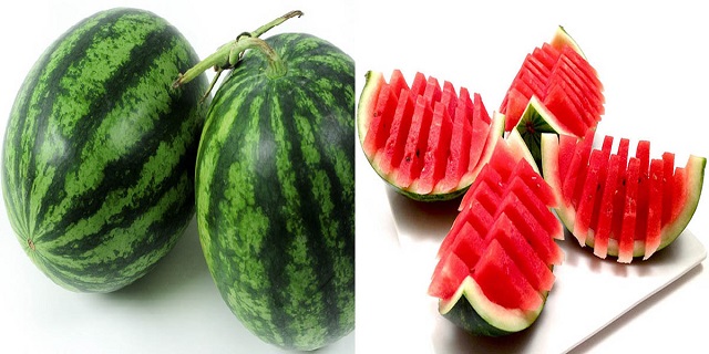 Bổ đôi quả dưa, rồi tiếp tục cắt theo chiều dọc để có 1/4 quả dưa.